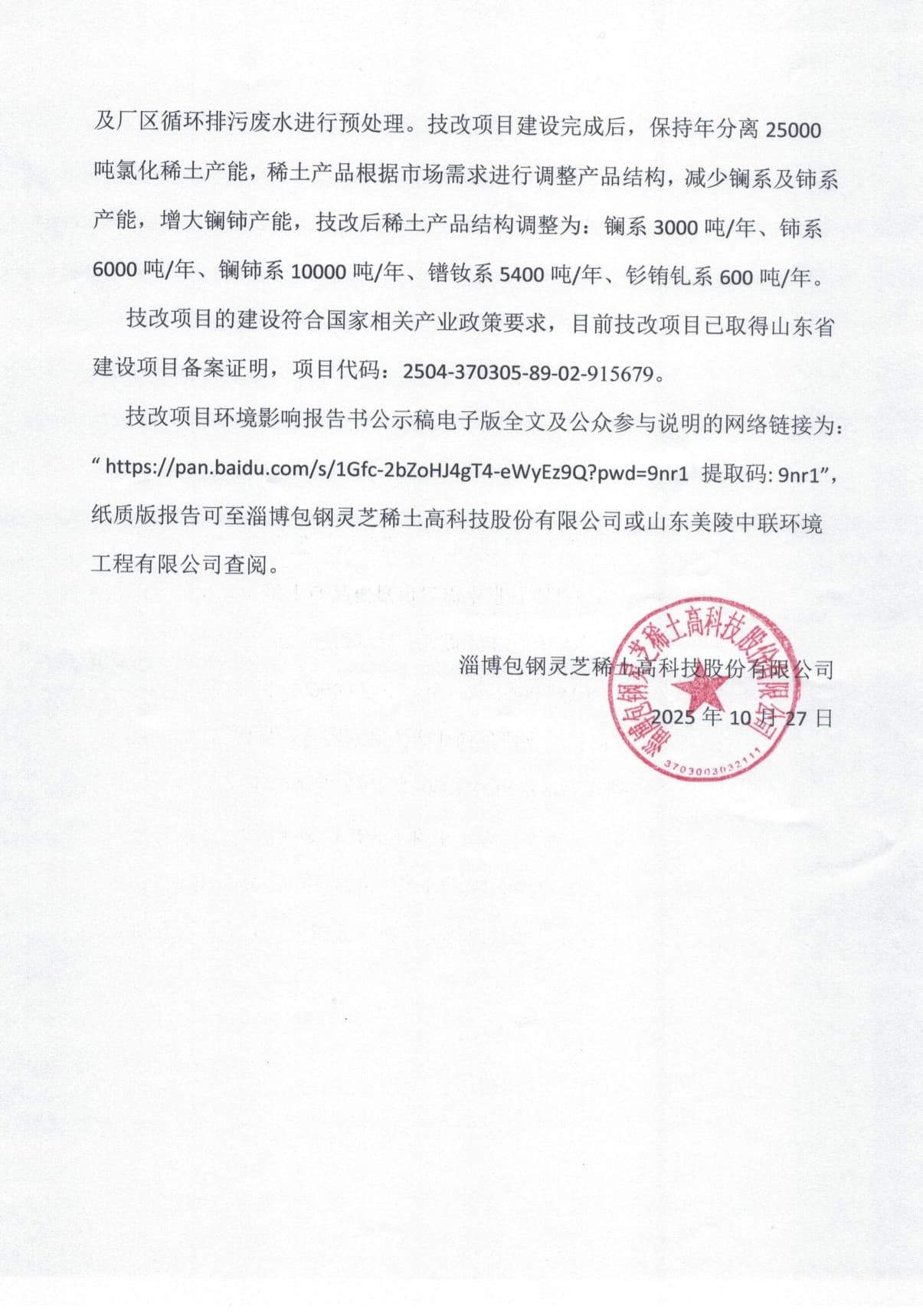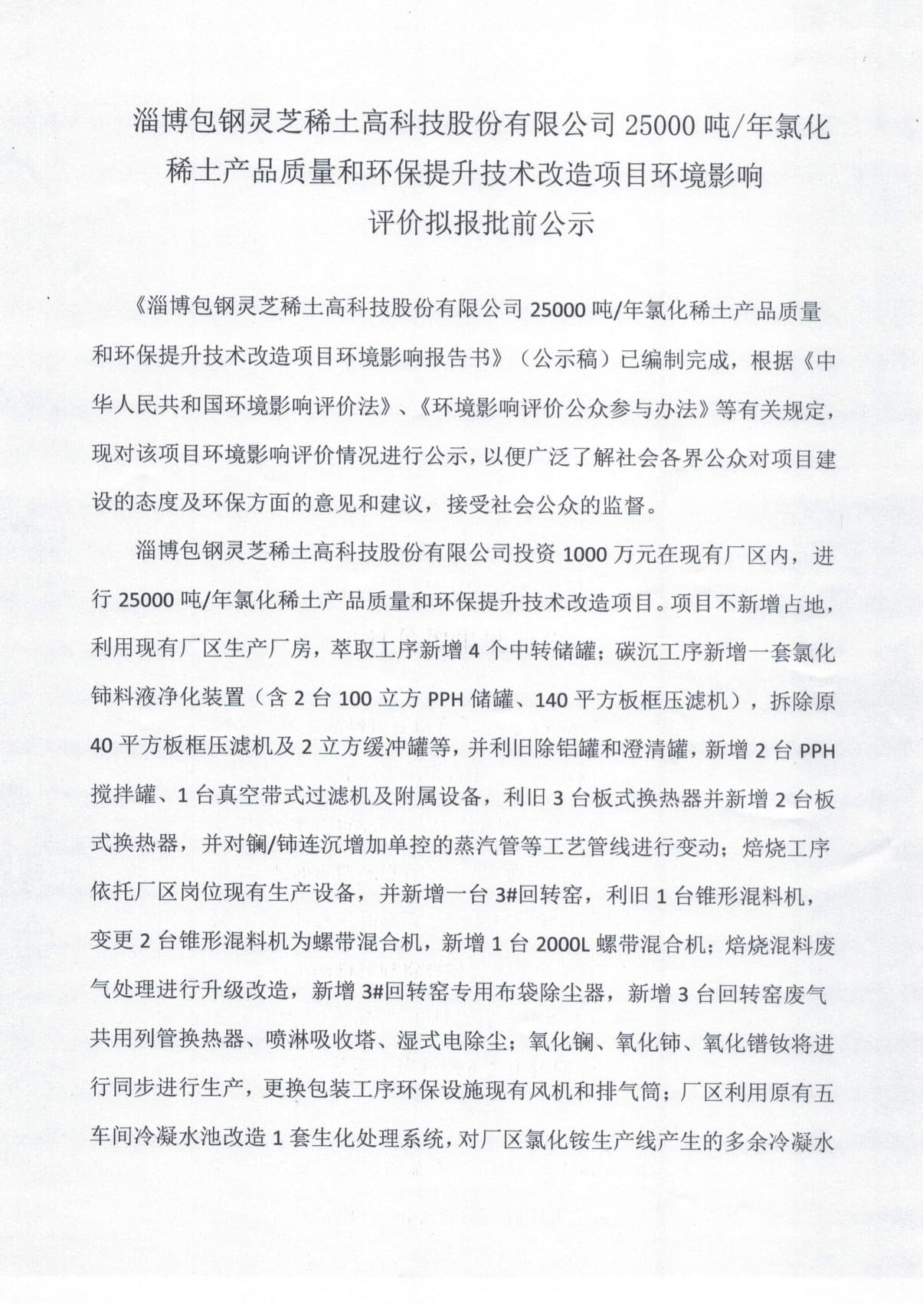 淄博包鋼靈芝稀土高科技股份有限公司25000噸/年氯化稀土產(chǎn)品質(zhì)量和環(huán)保提升技術(shù)改造項(xiàng)目環(huán)境影響評價(jià)擬報(bào)批前公示